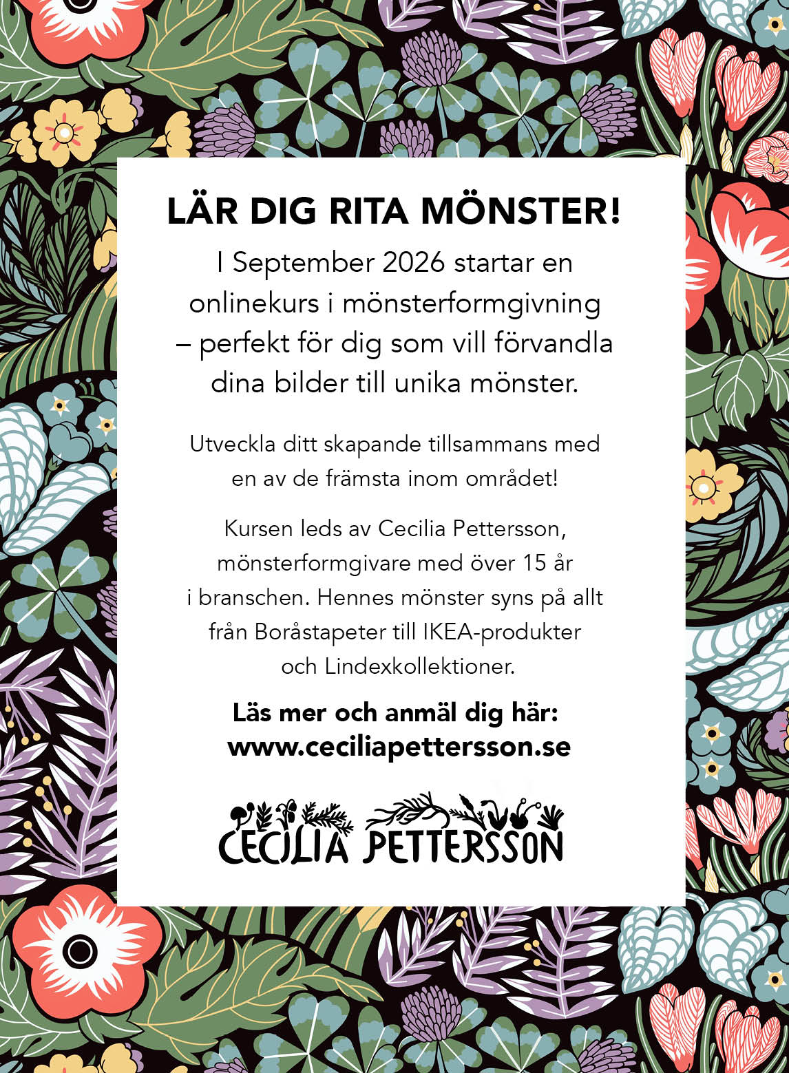 Hej! Jag heter Cecilia Pettersson och arbetar som frilansande designer och konstnär i Göteborg. Jag har en masterexamen i design från HDK (Göteborgs universitet, 2009) och är specialiserad på print och mönster.