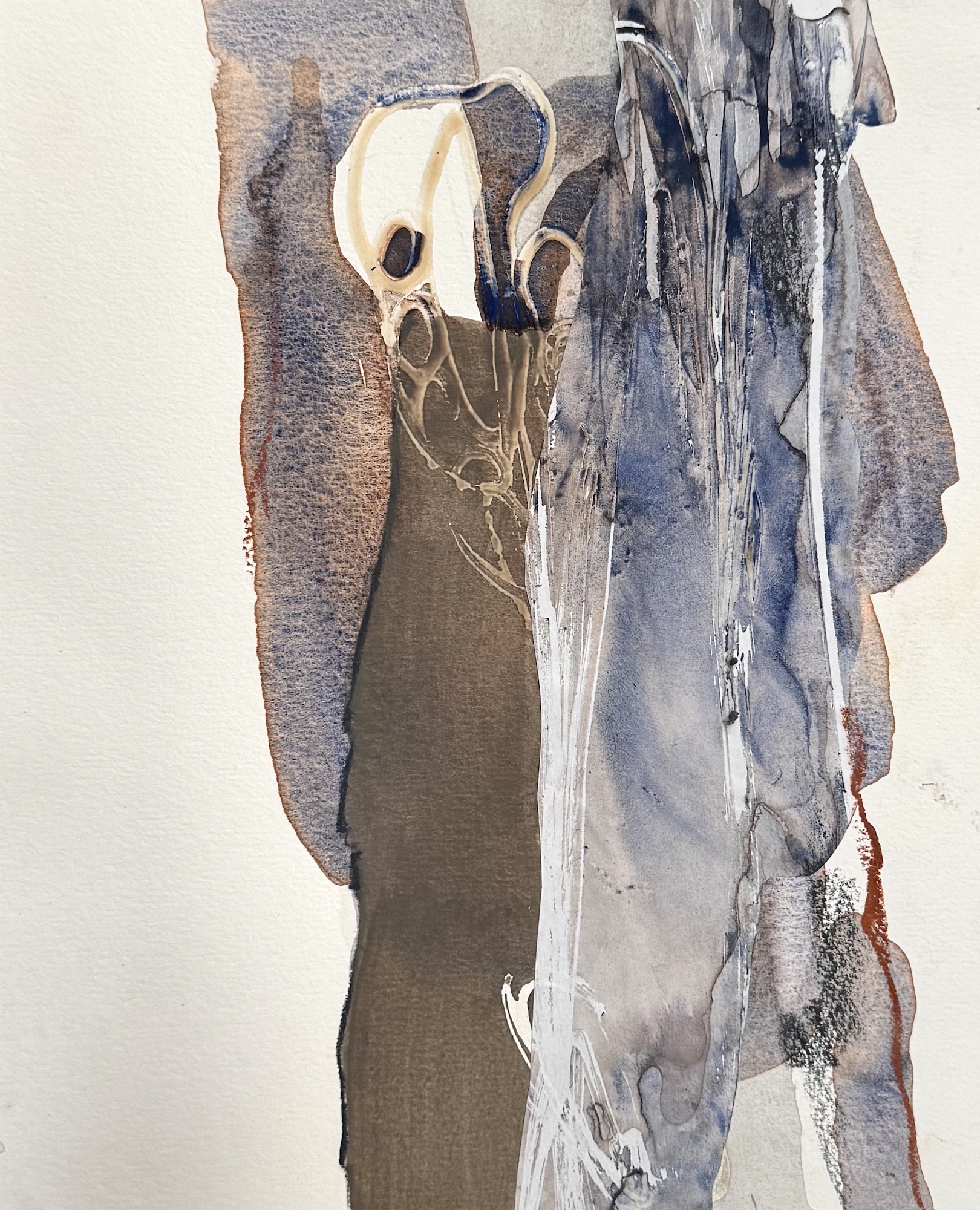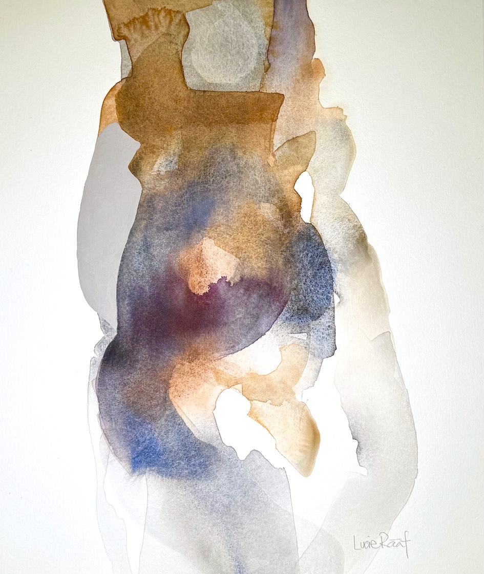 Det finns ingen tveksamhet i flödet. Men stopp. Jag måste ta ett djupt andetag. Pigmentet får torkar in på underlaget och bildar ett grafiskt mönster. I kommande lager med färg, åtrår jag ljuset och rytmen, fördjupar nyanser med sinnlighet. En stämning växer fram.