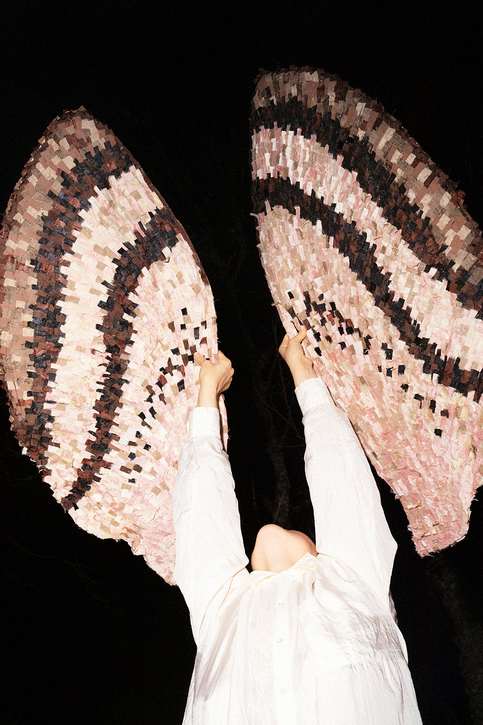 Hon berättar att den ena kommer ligga orörlig, död eller utmattad, medan den andra svävar omkring och jagar efter en ljuskägla som rör sig över golvet. Och det är den fjärilen, som alltså utformats som kostym, som Ingela kommer agera inuti under sin performance.