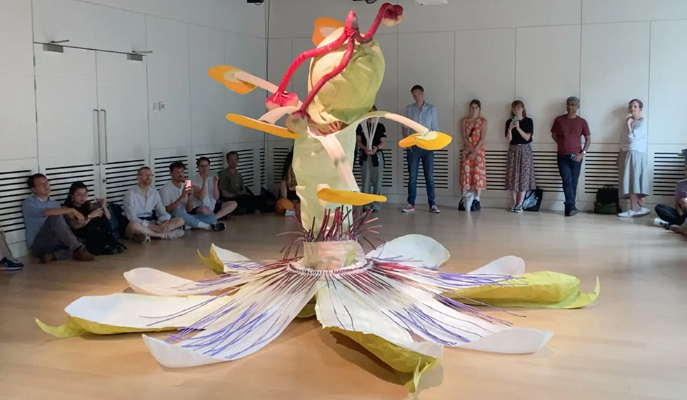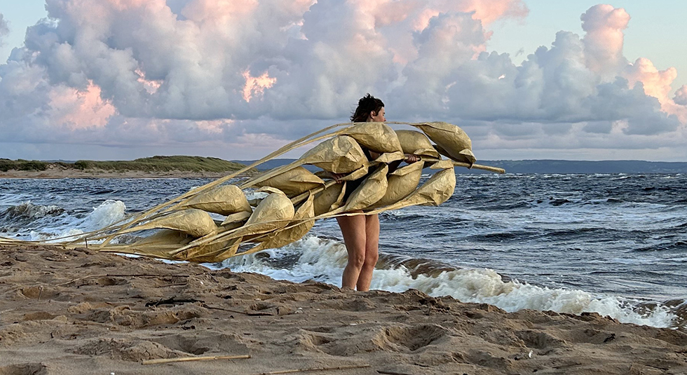 Just nu arbetar hon på en av sina skulpturkostymer i vilka hon agerar djur eller växt i tankeväckande performance där enkla skeenden iscensätts.