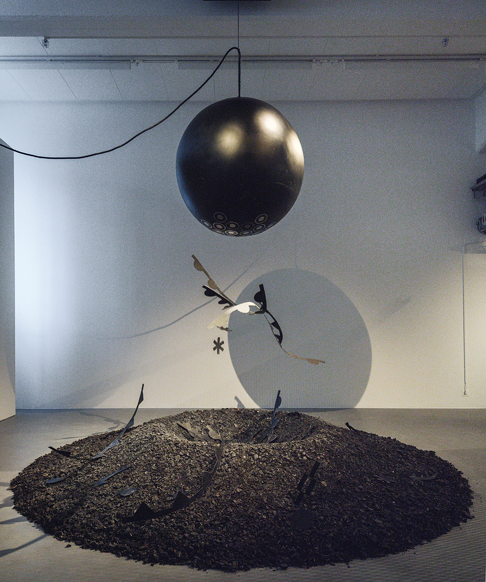 Det kan tyckas att det kontrollerade, visuella uttrycket i utställningen är opassande artigt och känslomässigt avstängt med tanke på det akuta ämnet. Därför är det välbehövligt att det längst in i utställningen pyser ut, en visserligen, kontrollerad ilska. I Denial Machine (2026) sänks en magnetisk mattsvart, wrecking ball ljudligt ned från taket, plockar med sig dinglande vädersymboler från en hög på golvet och höjs upp mot taket - för att skakigt börja om igen.