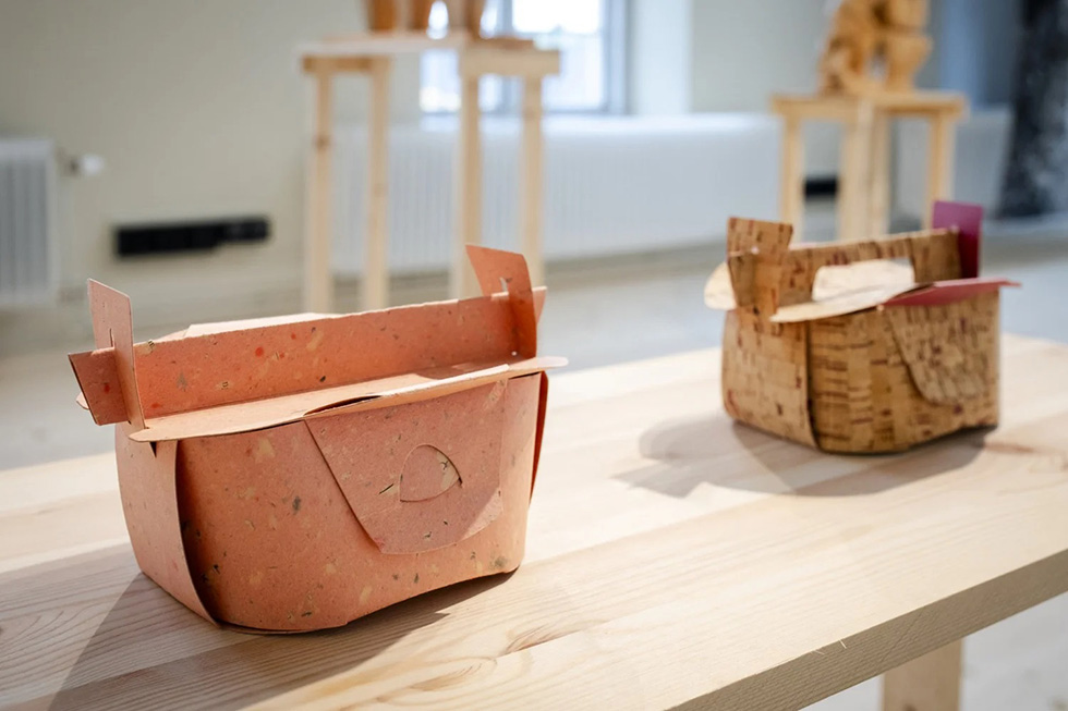 I Enno Halleks konstnärskap är havet ofta närvarande. En hängande, avlång träbit utgör den lekfullt abstraherade fiskkroppen, som har två huvuden – ett i varje ände. Färgvalen är typiska för Hallek, som ständigt återkommer till solnedgångar och regnbågar. Färgerna bryter av mot den råa träytan, som i kombination med det grovhuggna signalerar hantverk och närhet till naturen. Det stora utställningsrummet fylls av Lars Kleens verk Våg, som ställer människans skapelse mot naturens kraft. I vågens våld framträder fragmenten av en träbåt som slitits sönder. Ett dramatiskt förlopp fångat i ett fruset ögonblick, som speglar livets kretslopp av uppbyggnad och sönderfall, ett viktigt tema i hans konstnärskap. I skulpturen Skorpa – som uppstod ur ett intuitivt hantverk – Berit Lindfeldt ville se något växa fram bitvis utan att tänka för mycket på vad det skulle bli. Verket, som tidigare hade titeln Vandring, påminner om ett kuperat landskap, något upphöjt vilket skapar illusionen av att det svävar ovanför marken.