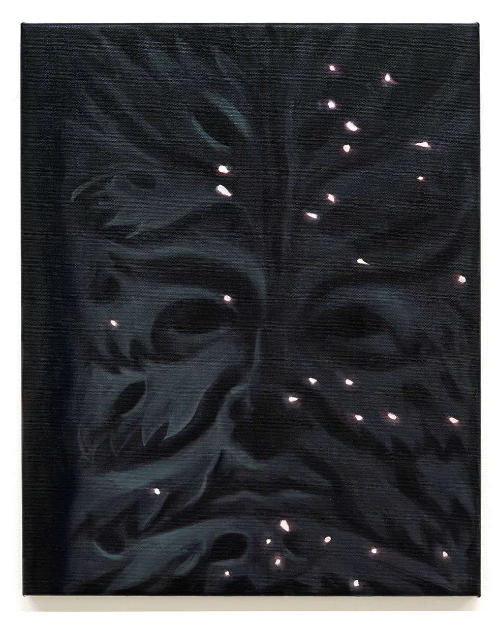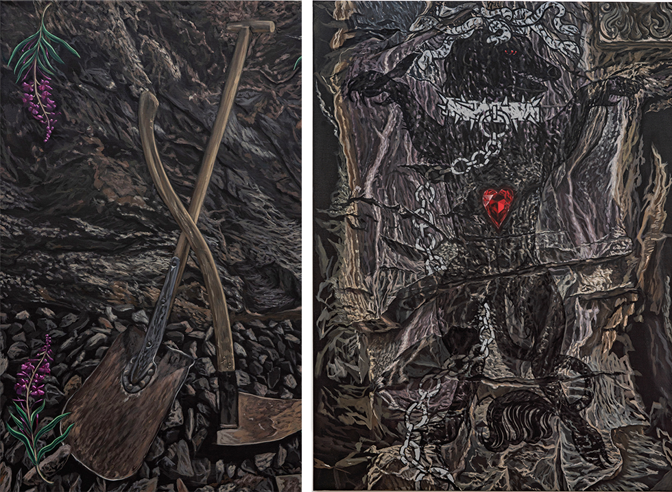 Roger Smebys målningar Jungfru (2017), Church (2024), Handskar (2023), Hacka & Skyffel (2024) och Skymning (2025) rör sig mot den värld som finns vid tågspåren utanför konsthallens fönster. Motiven består av arbetsjackor, arbetsskor och verktyg, funktionella objekt som Smeby återskapar i en lysande sfär av färg, textur och yta. Arbetet kopplas ihop med praktisk utrustning, stillsamma objekt som vibrerar tyst i sina egna distinkta nyttovärden, samtidigt som de rör sig vidare förbi denna funktionalitet och antar en symbolisk karaktär. I de nyproducerade verken Tunnel 17 (2025) och Tunnel 18 (2025) samt Morningstar (2023), Machete (2024) och Silhouette (2024) får vi följa med under jorden och in i tunnlarna, där välkända landskap av sten och järnväg får sällskap av formationer som drar oss mot en annan värld: spöklika gestalter, en djävulsfigur målad på sten, metallpålar som brutalt sticker ut från berg som liknar en hud eller en kropp. Dessa formationer, som Smeby möter under sitt arbete i tunnelbanan, omvandlas i hans bildvärld till något som destabiliserar det välkända och pekar mot en annan dimension, någonstans mellan dröm och verklighet. Läs mer om Roger Smedby >>