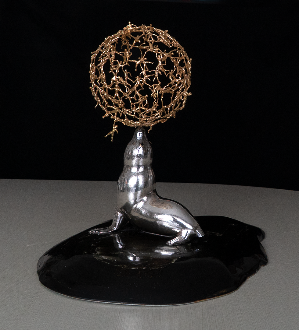 Olle Ohlsson. Sjölejon, av sterlingsilver, balanserar gestalter som formar en glob av 18 K guld. Underlag obsidian, 1990.
