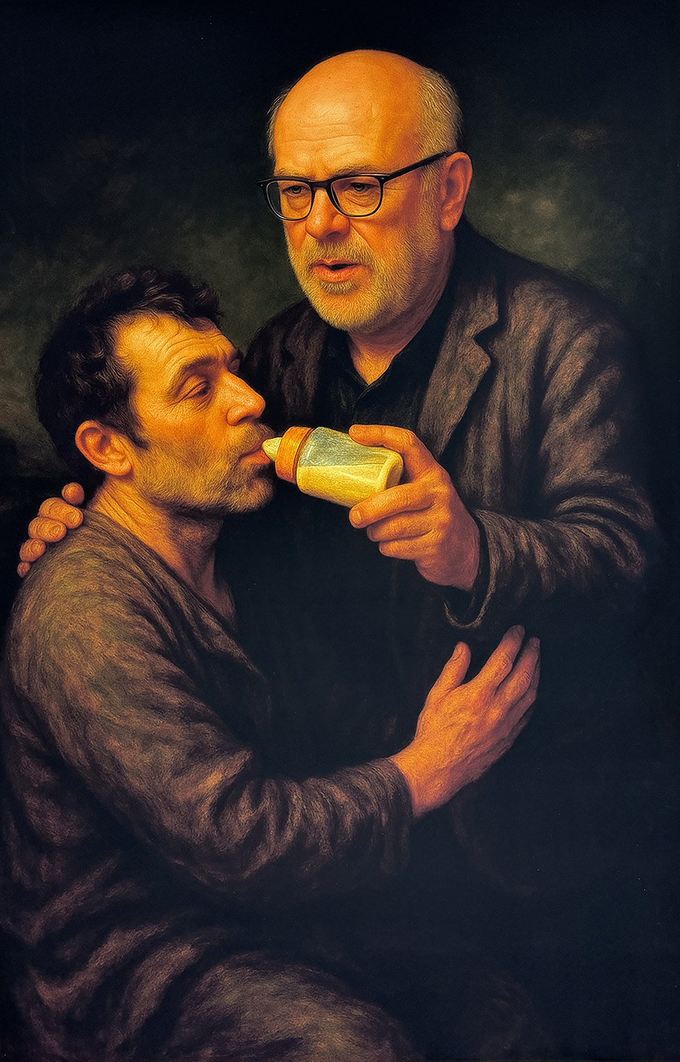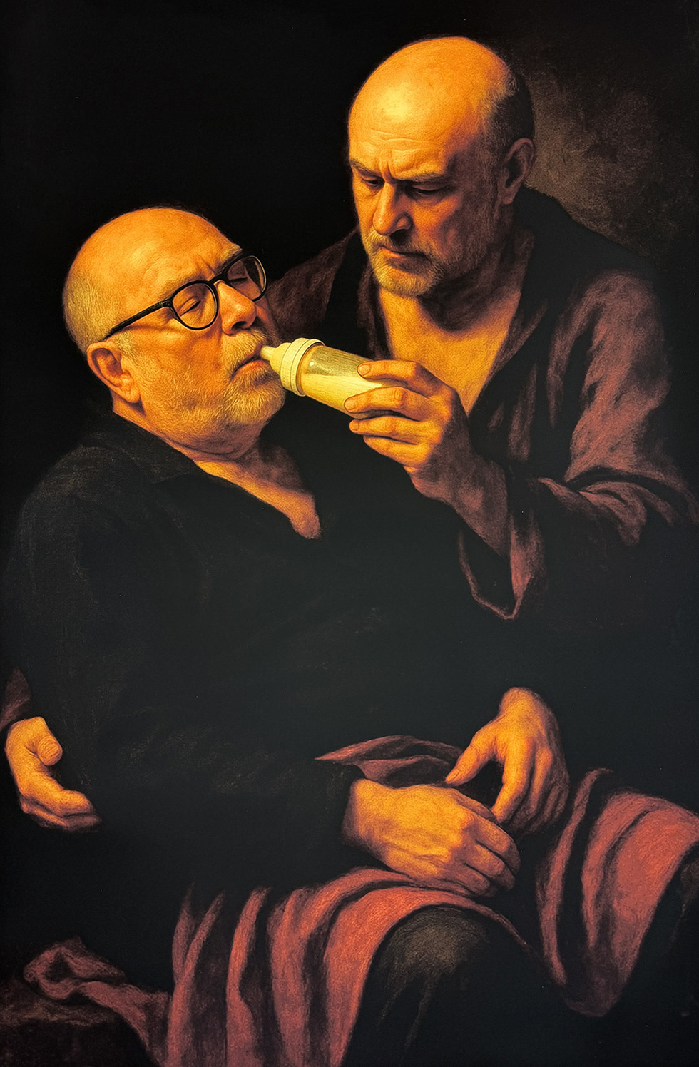 Motsägelsefullt och paradoxalt, men sådant är livet, och konstnärskapet – tungt, lätt, blygrått, förgyllt... armt och ymnigt. Men redan ute i galleriets reception har besökaren mött ett dussintal paradoxala tablåer (alla bilder är framställda genom enkla prompter till en AI-robot) vilka på ett överraskande och humoristiskt sätt skildrar symbiosen mellan Konstnären och Konsten (här Wolgers och Konsten), sådan symbios, sådant ömsesidigt beroende av vilket människan är skapad och som tar sig så många skiftande uttryck och former under livet, på gott och ont.