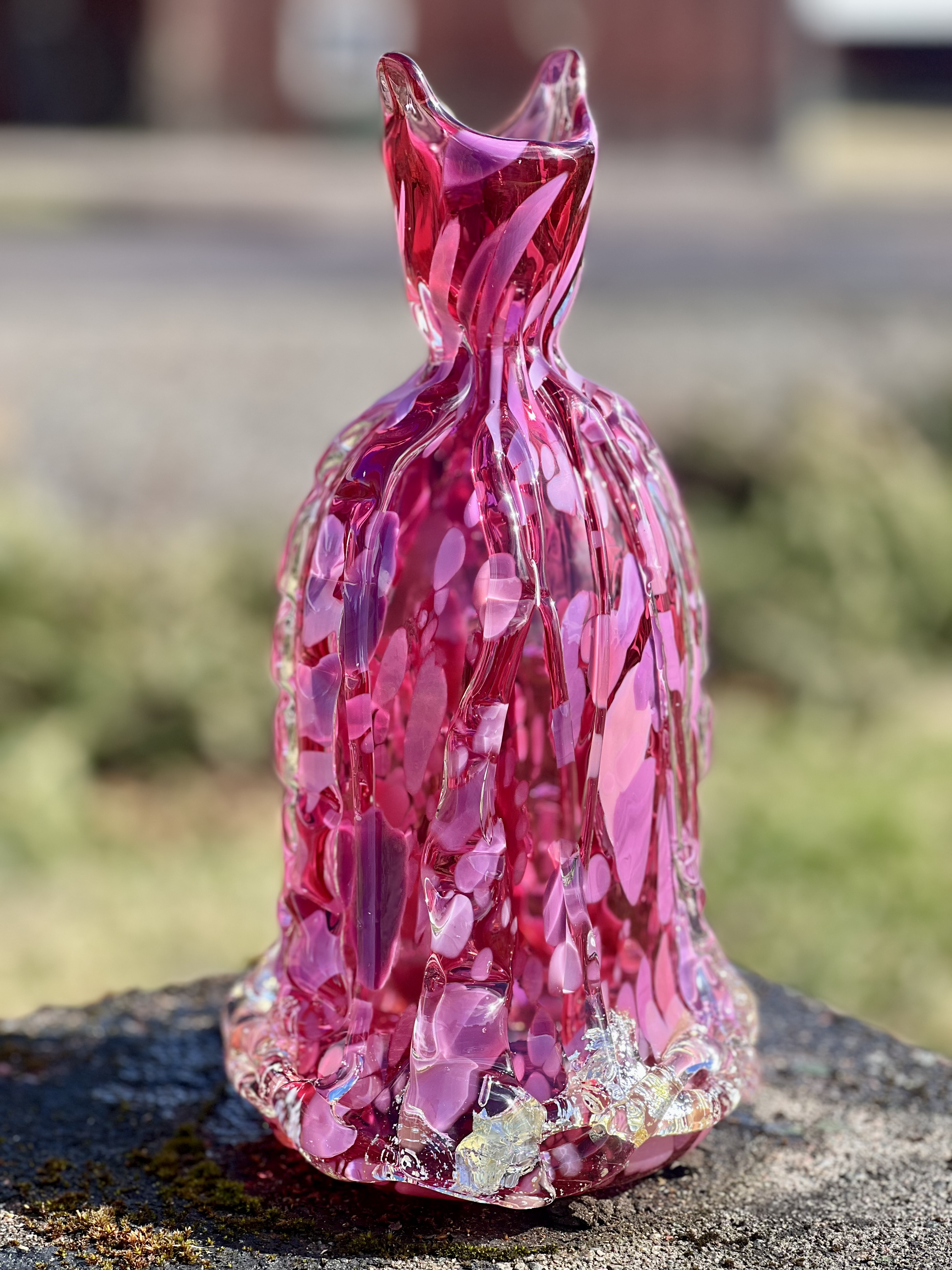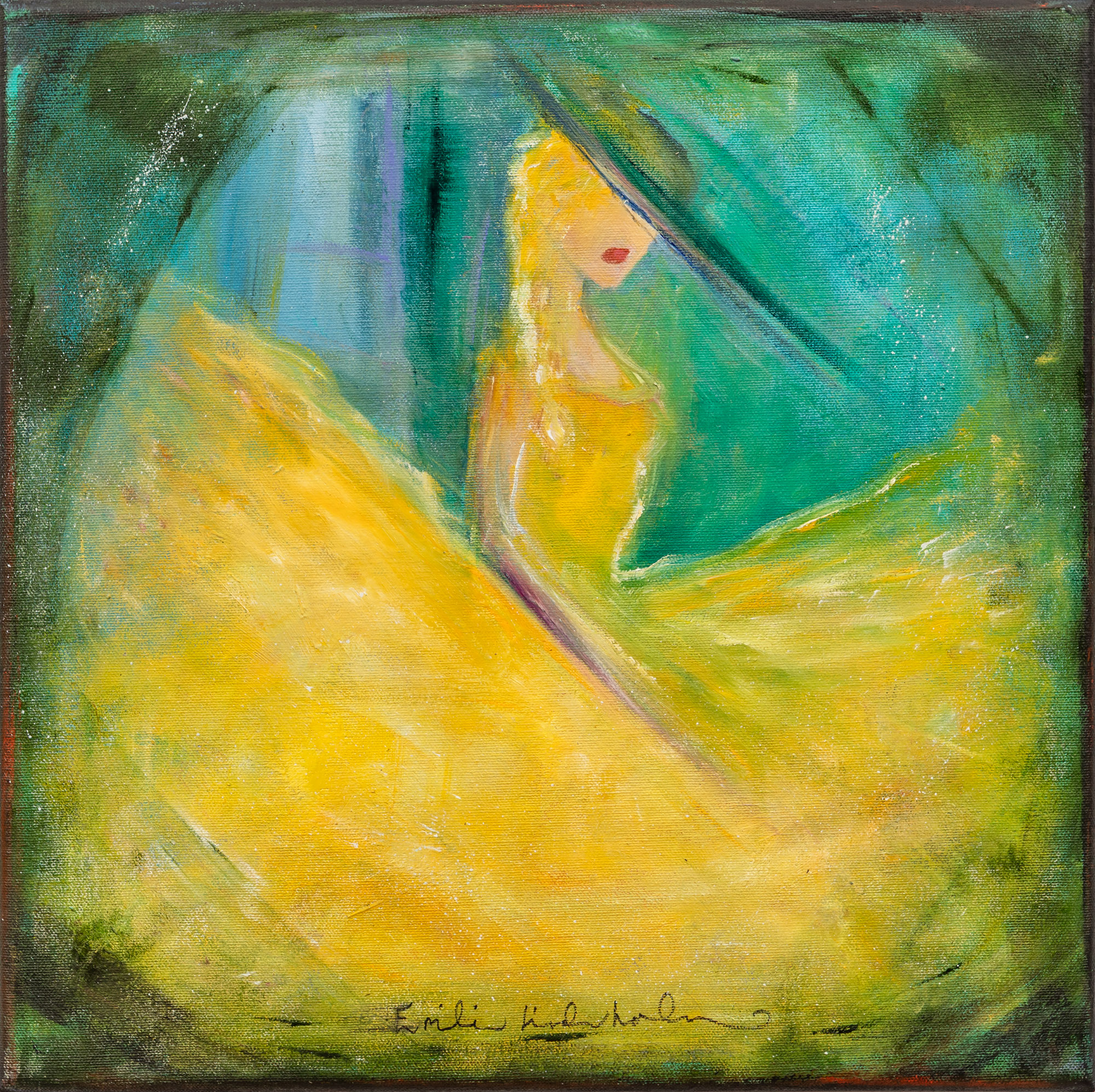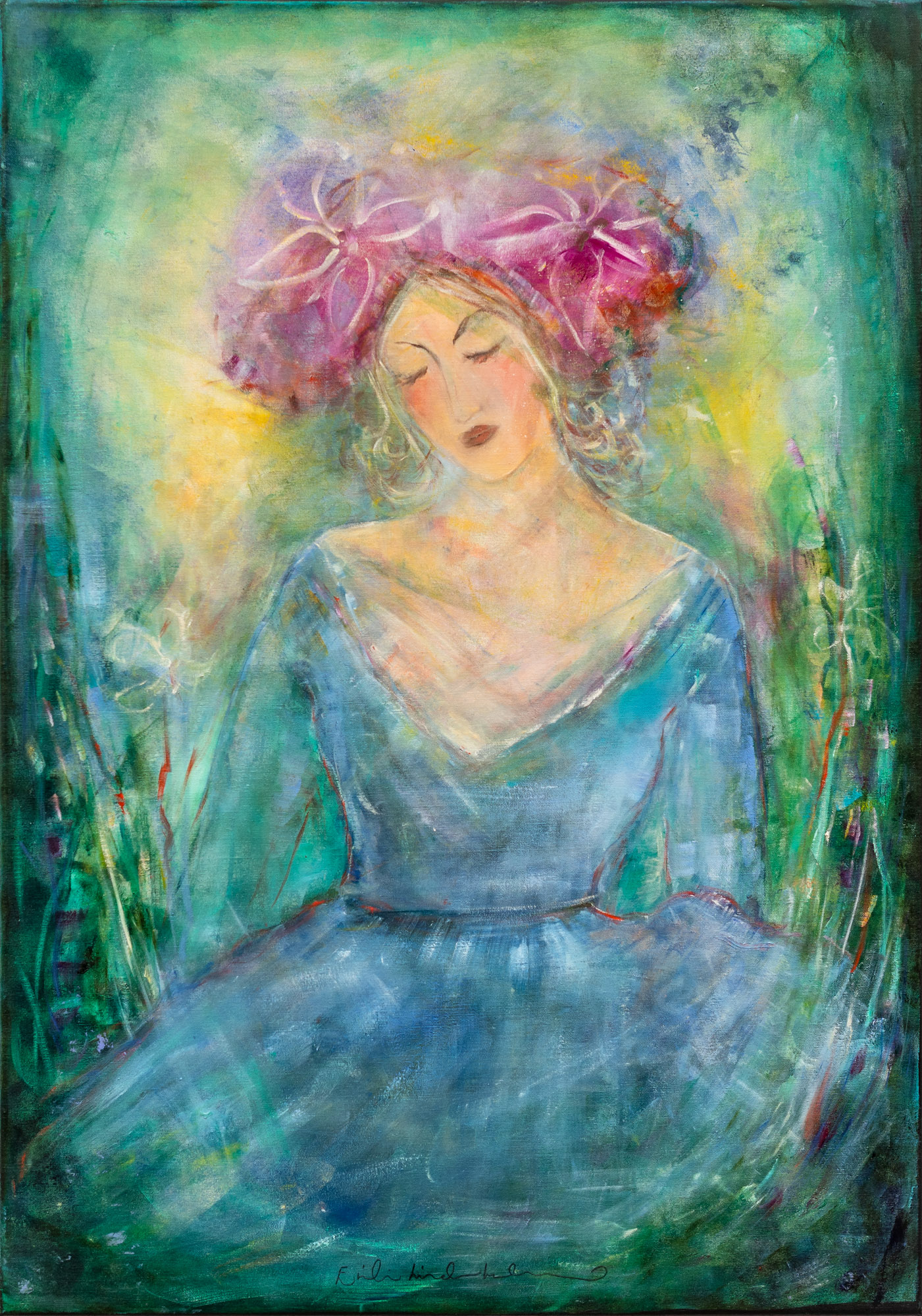 I Linderholms måleri bär färgen berättelsen. Gröna nyanser av klorofyll möter mjuka rosa toner i en bildvärld fylld av grönska, ljus och vårens första aning. Kvinnliga gestalter återkommer — drömmande, starka och tidlösa — och samma formspråk lever vidare i hennes glas, där figurerna får liv i ljus och transparens. Mellan stillhet och intensitet växer en värld fram av fantasi, färg och form.