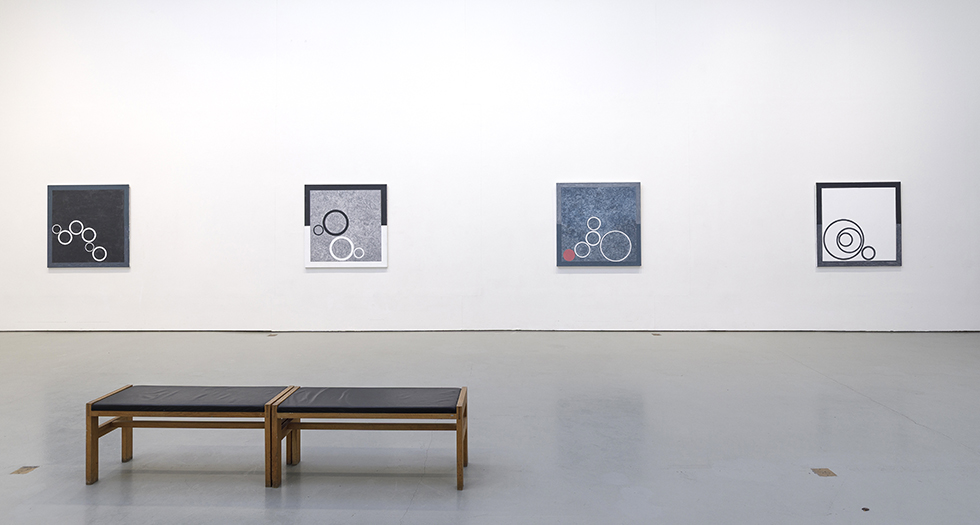 En teckning reducerad till cirklar frigjorde snart min fantasi. Vita cirkulära tecken intog snart rummet på kvadratens yta. Ett slags ställföreträdare. Lodets gravitetiska allvar infann sig inte alltid. Teckningen inbjöd ibland till ett visst lättsinne. " /