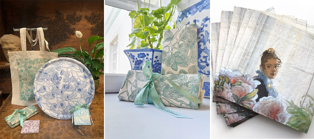 Här finns konstböcker, vackra brickor, tygkassar, anteckningsböcker, servetter och bokmärken inspirerade av museets samling.