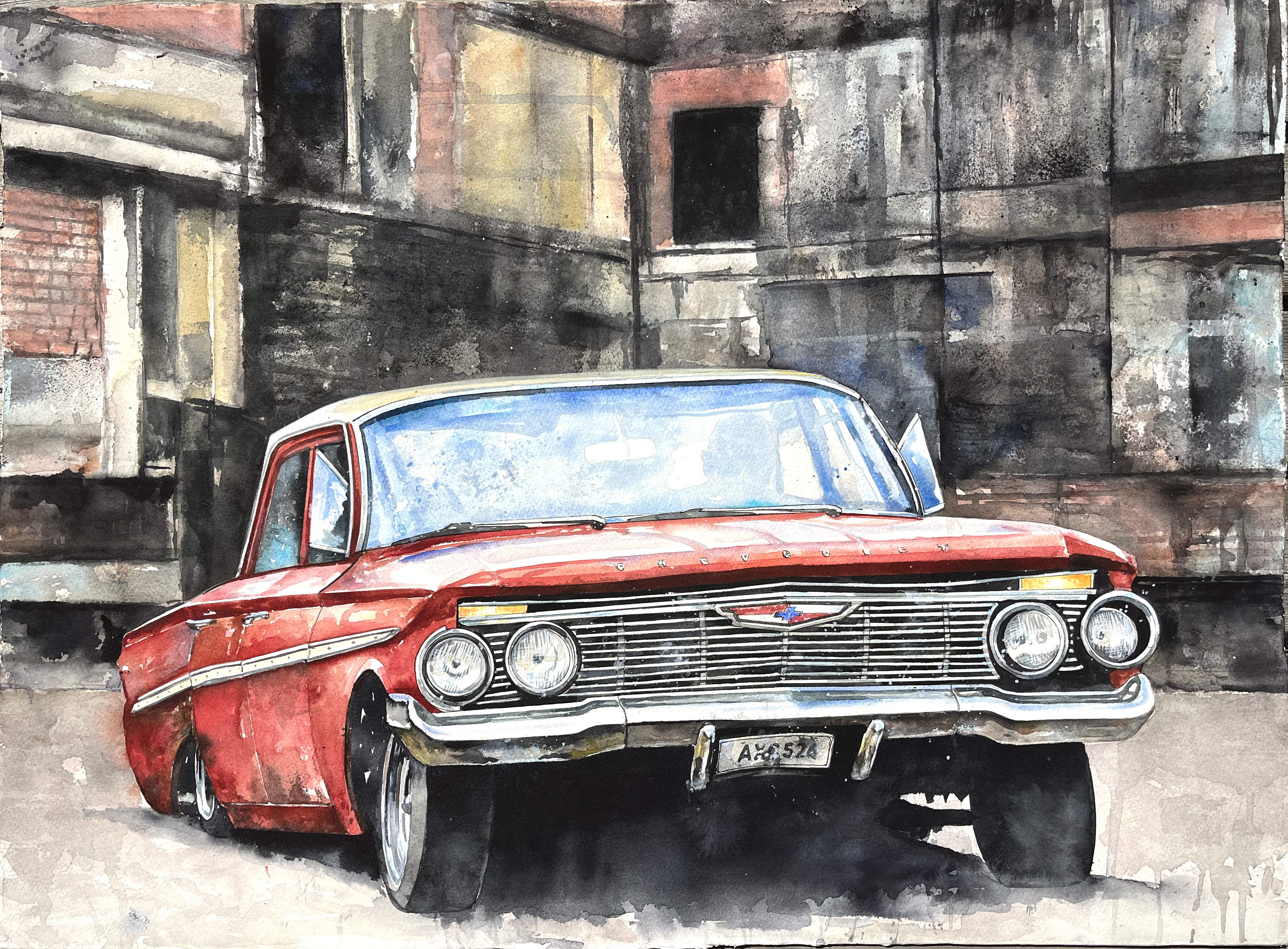 Inom den japanska filosofin om Wabi Sabi betraktas åldrande och slitage som en naturlig del av ett föremåls eller en persons historia och beskriver just det jag vill skildra i mina akvarellmålningar av dessa gamla motorcyklar och bilar. Wabi kan översättas till ”dämpad, stram skönhet”, Sabi står för rost och patina. Akvarelltekniken illustrerar detta fint med sina slumpartade rinningar och stänk. Jag vill förmedla en poetisk och lite bitterljuv känsla, fordonen bär på minnen från ett långt liv på vägarna, några rullar fortfarande, andra håller naturen sakta på ta tillbaka.