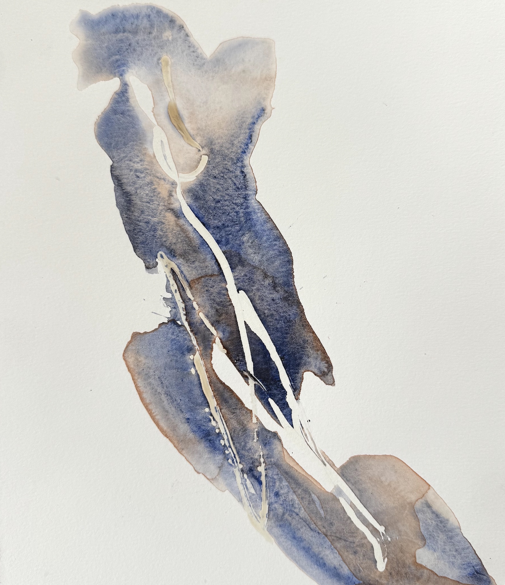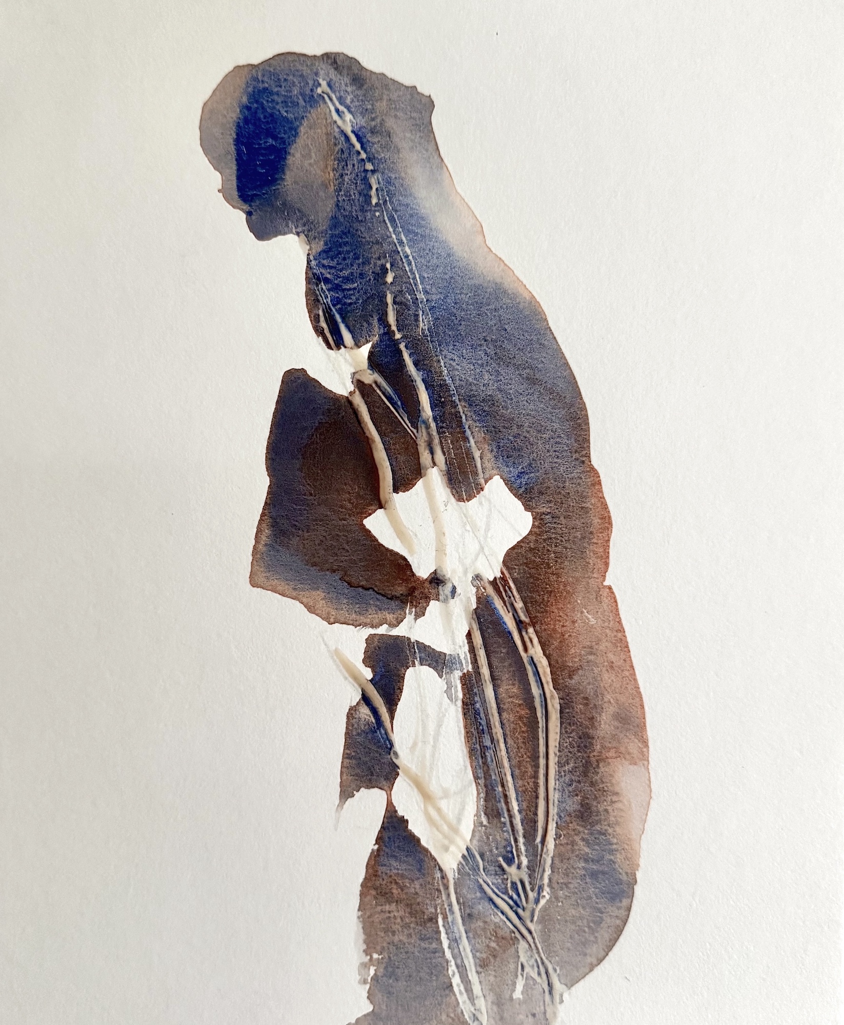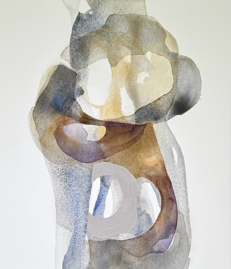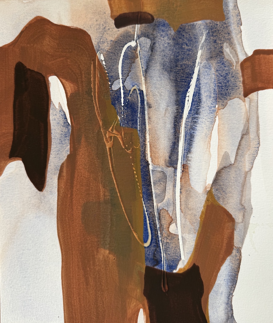 Det finns ingen tveksamhet i flödet. Men stopp. Jag måste ta ett djupt andetag. Pigmentet får torkar in på underlaget och bildar ett grafiskt mönster. I kommande lager med färg, åtrår jag ljuset och rytmen, fördjupar nyanser med sinnlighet. En stämning växer fram.