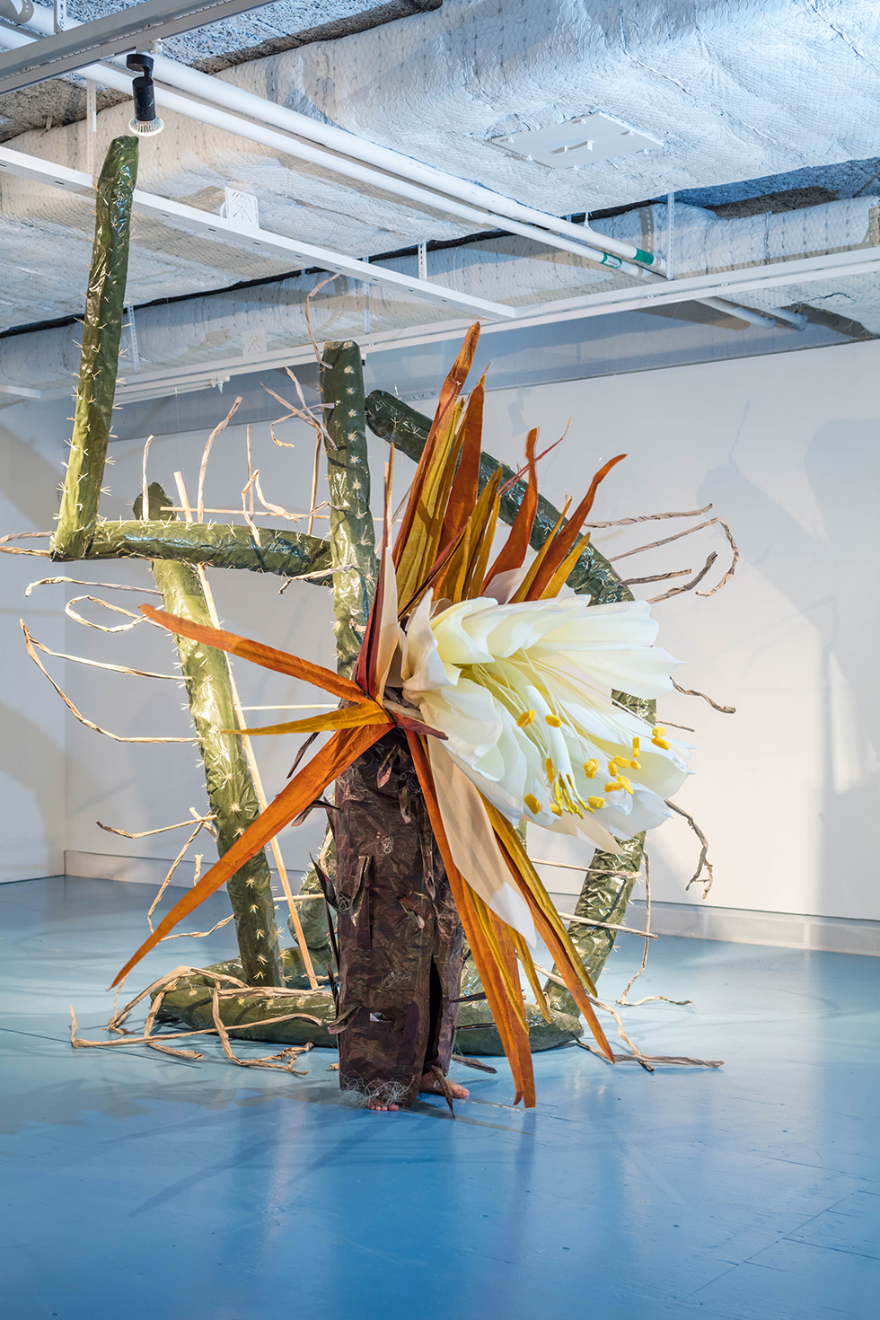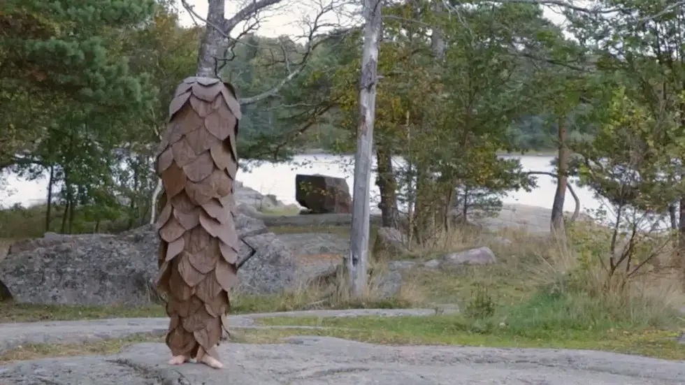 Just nu arbetar hon på en av sina skulpturkostymer i vilka hon agerar djur eller växt i tankeväckande performance där enkla skeenden iscensätts.