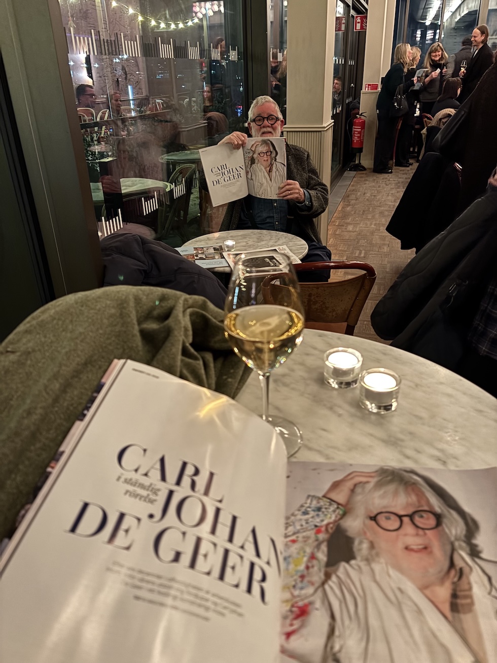 På plats fanns chefredaktör Jens Christiansen och redaktör Susanne Johansson, liksom skribenten Bo Madestrand som står bakom ett av numrets huvudreportage – en intervju med Carl Johan De Geer i hans ateljé. Även Carl Johan De Geer själv var där (se bild nedan), tillsammans med Helle Knudsen från Galleri Helle Knudsen, där hans nästa utställning äger rum.
