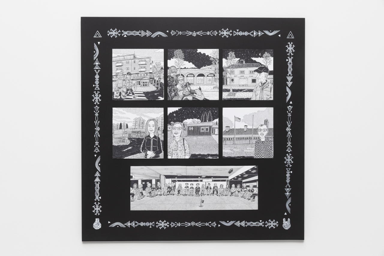 Det samiska landskapet, dess naturresurser, gränser, ritualer och rötter återkommer genom hela utställningen. I målningar, installationer, skulpturer och hantverk blir landskapet både konst och politiskt territorium.