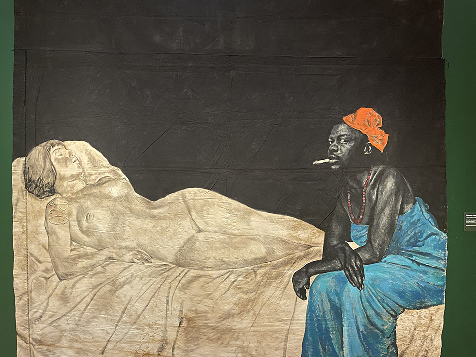 Alldeles nära hänger ett stort linnetyg, brett som en dubbelsäng. Det hänger löst utan ram och visar upp en annan sängkammarscen. Roméo Mivekannin från Elfebenskusten kallar sin målning Le modèle noir, d’après Félix Vallotton, 2019. Det är en parafras på Vallottons nästan hundra år gamla verk där en vit nakenmodell ligger på sängen och en svart påklädd modell tittar på henne. I Mivekannin version har båda slutat vara redskap. Den vita kvinnan har bleknat till bakgrund, fantasi eller skulptur och den svarta har kommit till liv. Hon betraktar oss, istället för att upplåta sin kropp till allmän beskådan. De svarta som antingen osynliggjordes eller framställdes stereotypiskt träder nu fram, och för somliga kanske det är läskigt. Hela målningen är som ett lekfullt spöke. Det vita fladdrande tyget, den ominösa koloriten och en fastnaglande blick.