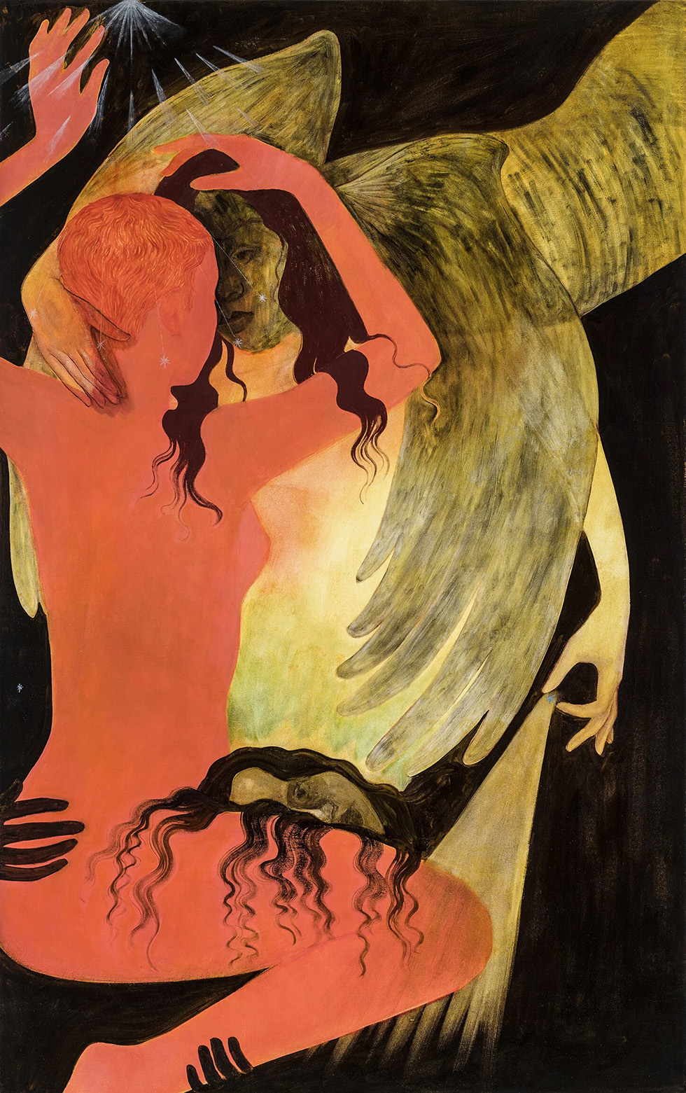 Naudline Pierre från USA plockar upp den historiska tråden och spinner vidare till renässansen med målningen Close Quarters, 2018. Som i en drömsyn med uppdriven kolorit skildrar hon änglar, vanliga dödliga och kanske lite djävulskap också. Det är en ömsint omfamning där människan bor granne med gud. Är det inte det som andlighet handlar om? Ett sammanflätande av det metafysiska med det vardagliga i hopp om att förbättra existensen och överskrida nuet?