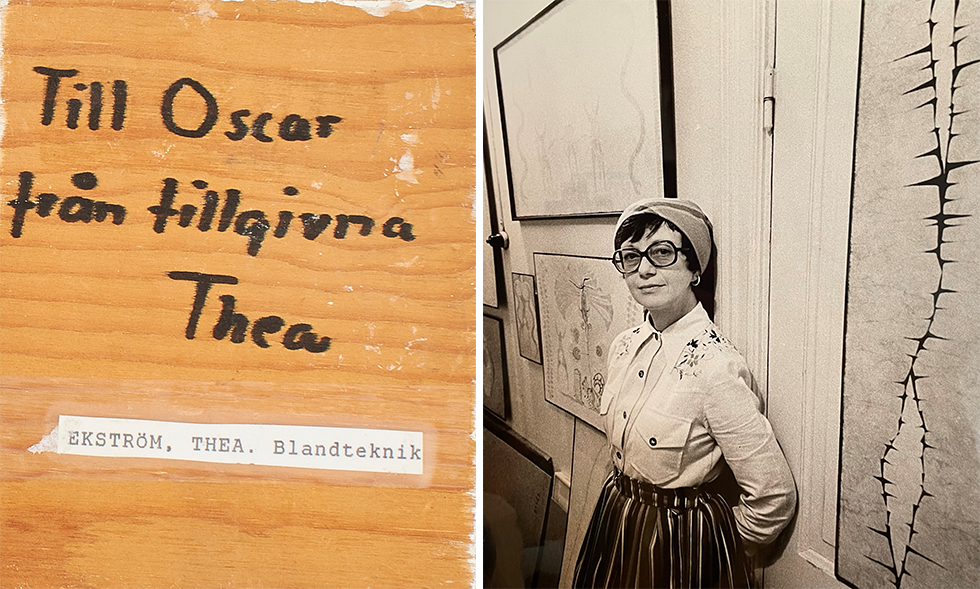 Vänster: Thea Ekström testamenterade sin kvarlåtenskap till Oscar Reutensvärd. Höger: Thea i sin ateljé intill "Sprickan". Foto: Privat