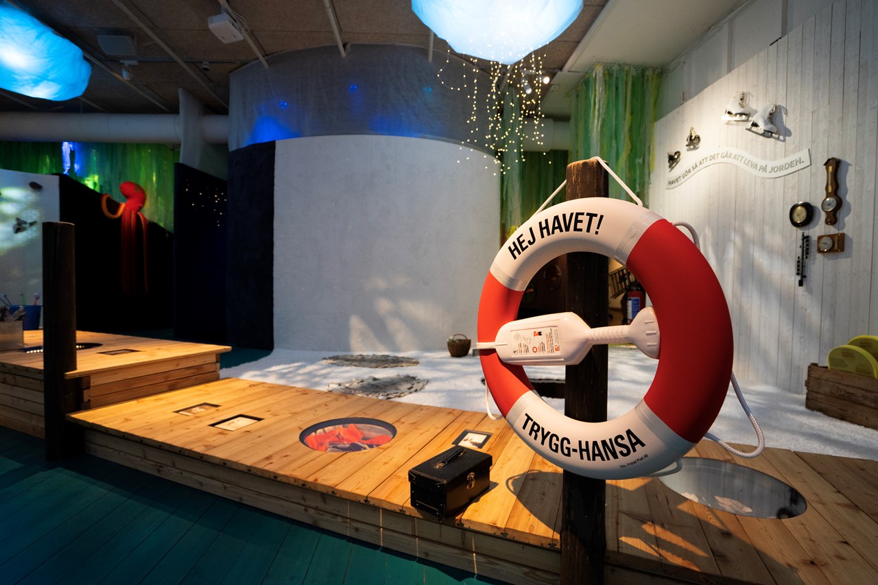 Hur många kan få plats i en sillburk? Prova själv. Lägg in dig med en fisk eller två. Styr sedan kosan mot vilket hav du vill. Längst ut vid stranden står en trut och hälsar dig välkommen eller vinkar farväl till den som seglar vidare. Under bryggan finns ett skaldjursgarage där besökare kan parkera krabbor och humrar på hjul. I Hej Havet! kan du genom lek och upplevelser upptäcka folktro, mareld, strandskator och tång. Här kan du hitta inspiration för att sedan ge dig ut och möta havet där ute på egen hand. Välkommen in! Och hitta ut!