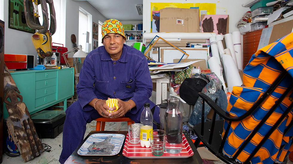 Porträttbild av konstnären Eric Magassa i sin ateljé i Göteborg. Foto: Peter Claesson