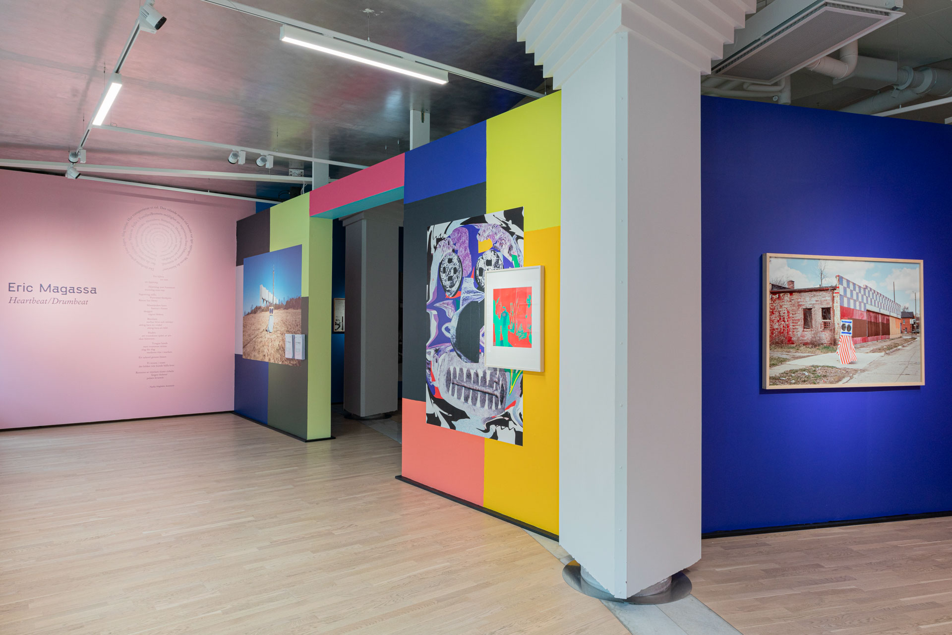 I utställningen Heartbeat/Drumbeat skapar Eric Magassa rum genom flera lager av uttryck – bild, färg, ljud och rörelse – som möts och korsas i en rumslig komposition, en rytmisk och pulserande orkester som binder det personliga med det kollektiva och som varsamt varvas med andra verk.