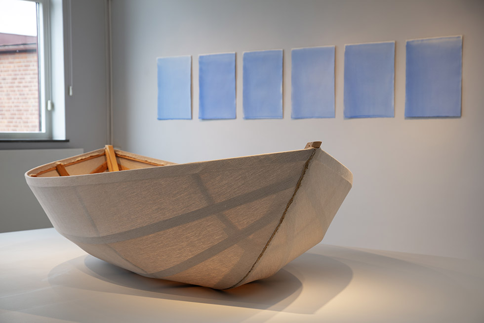 Cecilia Edefalk hade själv båtflyktingens situation i tankarna när En båt skapades 2017. En liten rund målning är förebild för båtens form och blå monokroma akvareller på väggen intill kan läsas som himmel eller hav.