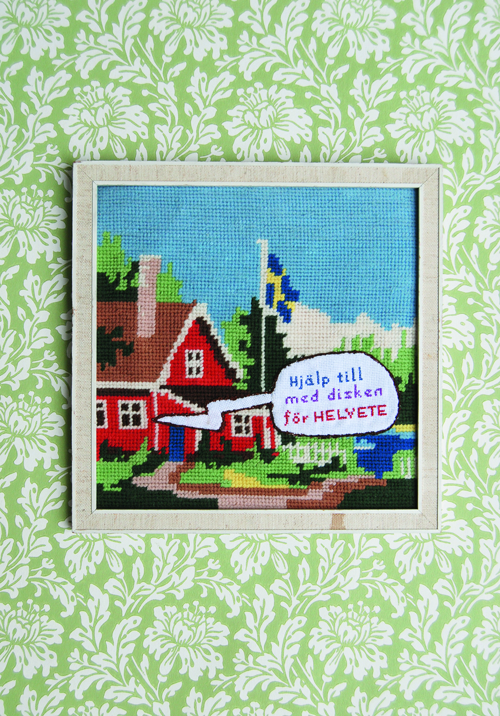 Nyhetsflasharnas snabba tempo är en central inspirationskälla i Lotta Sjöbergs broderi. I kontrasten mellan det flyktiga nyhetsflödet och ett långsamt, handgjort hantverk växer politiska kommentarer fram, formulerade som textila dagsverser.