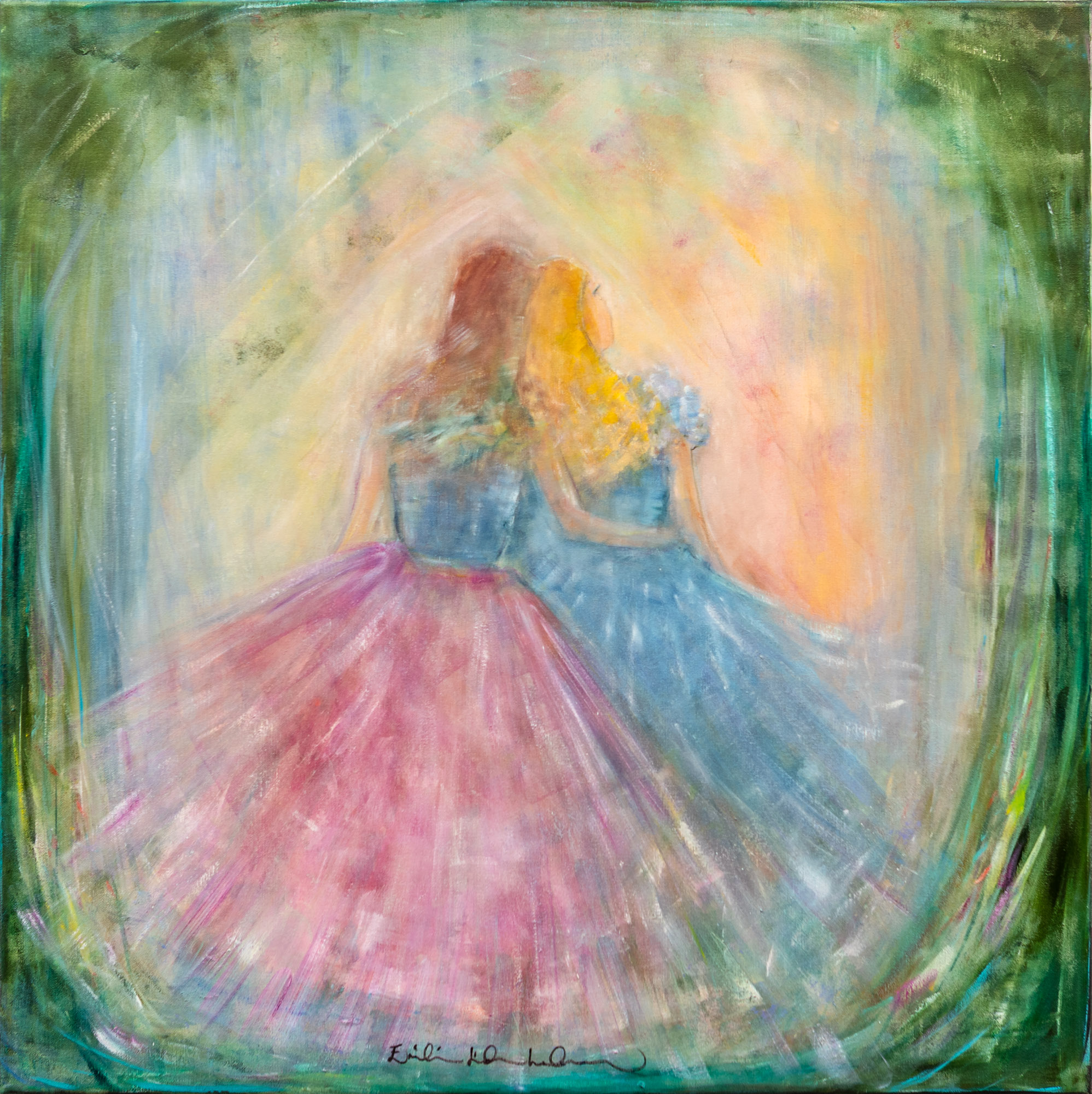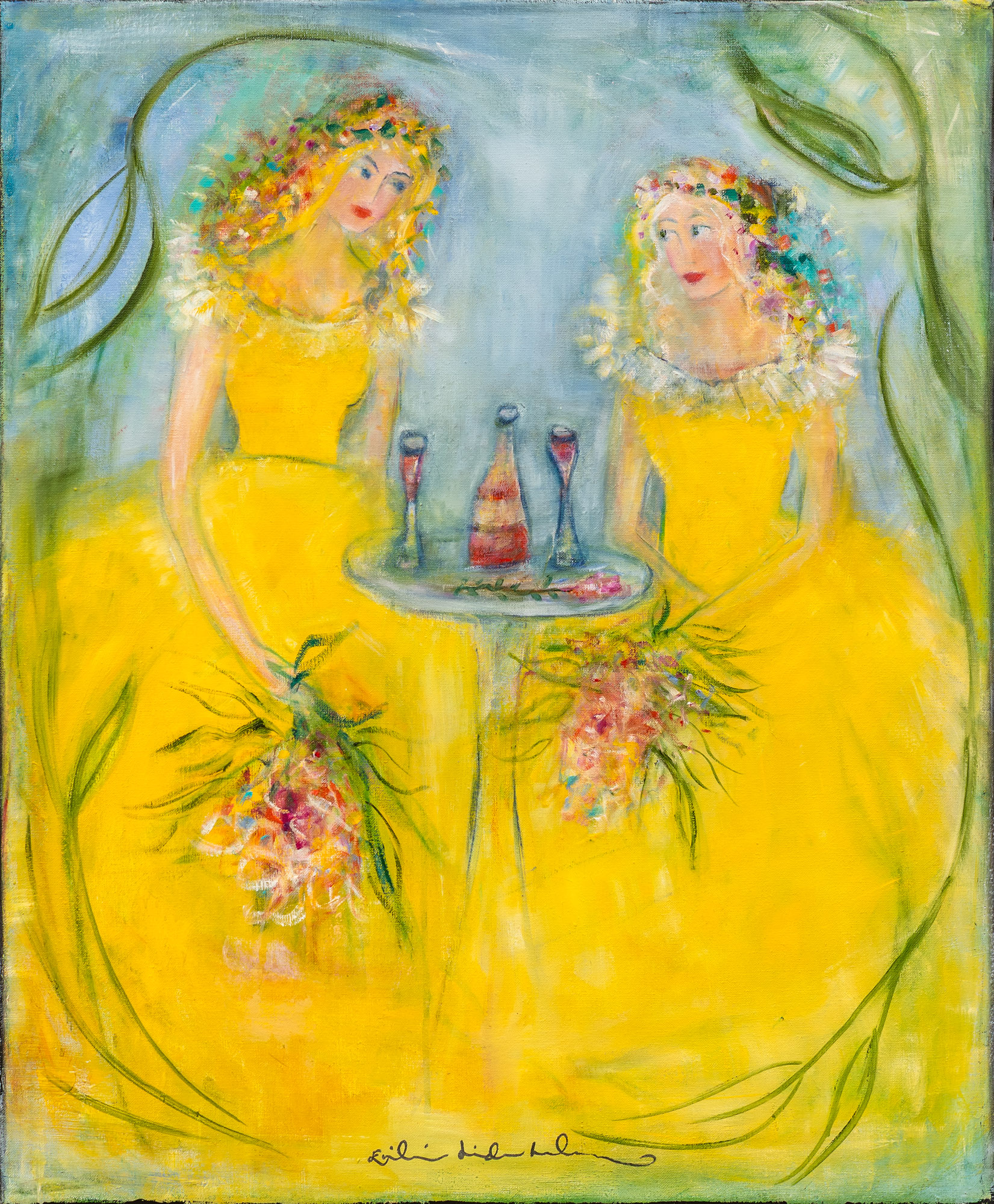 I Linderholms måleri bär färgen berättelsen. Gröna nyanser av klorofyll möter mjuka rosa toner i en bildvärld fylld av grönska, ljus och vårens första aning. Kvinnliga gestalter återkommer — drömmande, starka och tidlösa — och samma formspråk lever vidare i hennes glas, där figurerna får liv i ljus och transparens. Mellan stillhet och intensitet växer en värld fram av fantasi, färg och form.