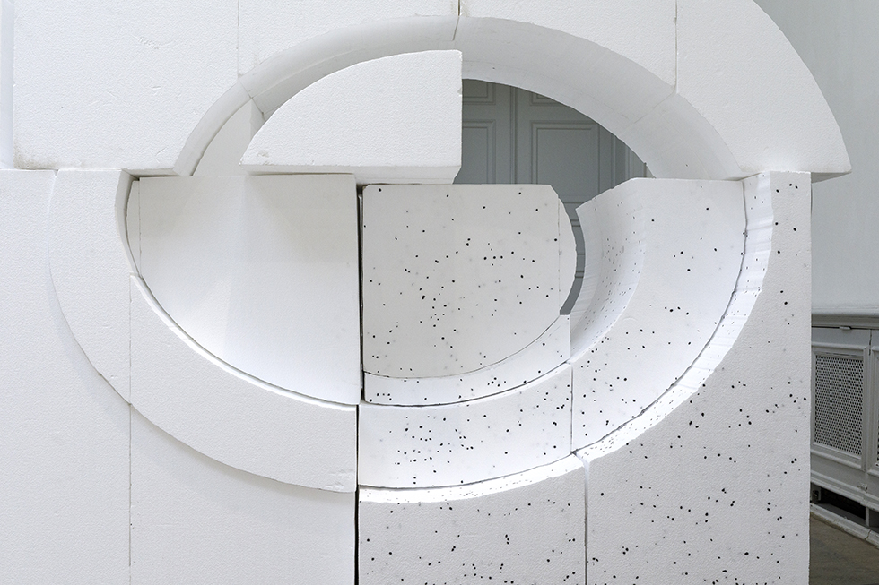 "Det går att urskilja en kontinuerlig linje, men den är uppbruten och kraftigt förskjuten. Den lätta cellplasten vadderar och skyddar. Den håller om ett avstånd och kontrasterar mot stålvajrarnas beslutsamhet. Det pågår en rumslig förhandling om vad som är permanent och vad som är förgängligt, om konstruktionens betydelse och vad som skiljer insida från utsida.